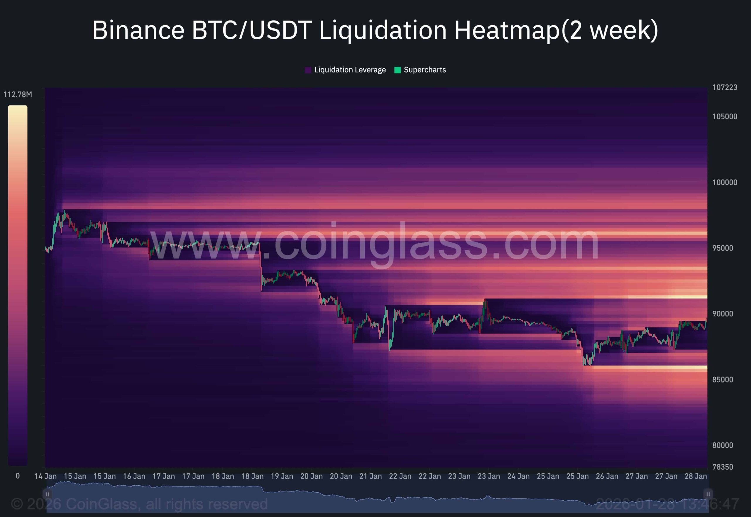 Desde la perspectiva de derivados y posicionamiento, el mapa de liquidaciones muestra un claro desequilibrio en la distribución de liquidez. Existe una concentración significativa de liquidez por encima del precio actual, especialmente en la zona media de los $90.000, lo que sugiere que la exposición del lado corto sigue siendo vulnerable si el activo logra avanzar al alza.