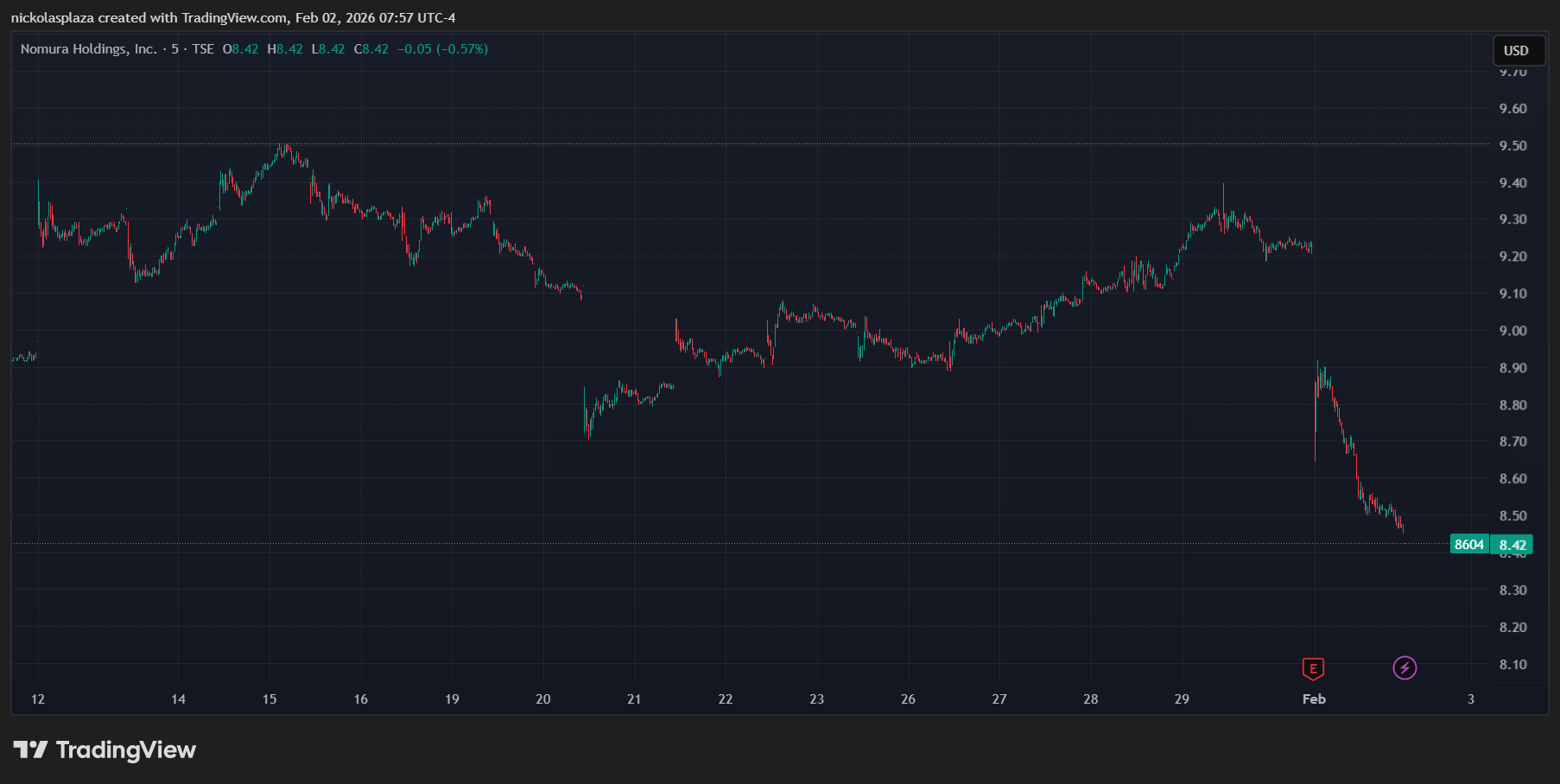 Las acciones de Nomura Holdings se vieron afectadas en enero; desde el 15 de enero que estaban en 9,5 dólares cayeron hasta los 8,42 dólares hoy, 2 de febrero. Esto representa una caída de 11,3% en el precio de sus acciones.