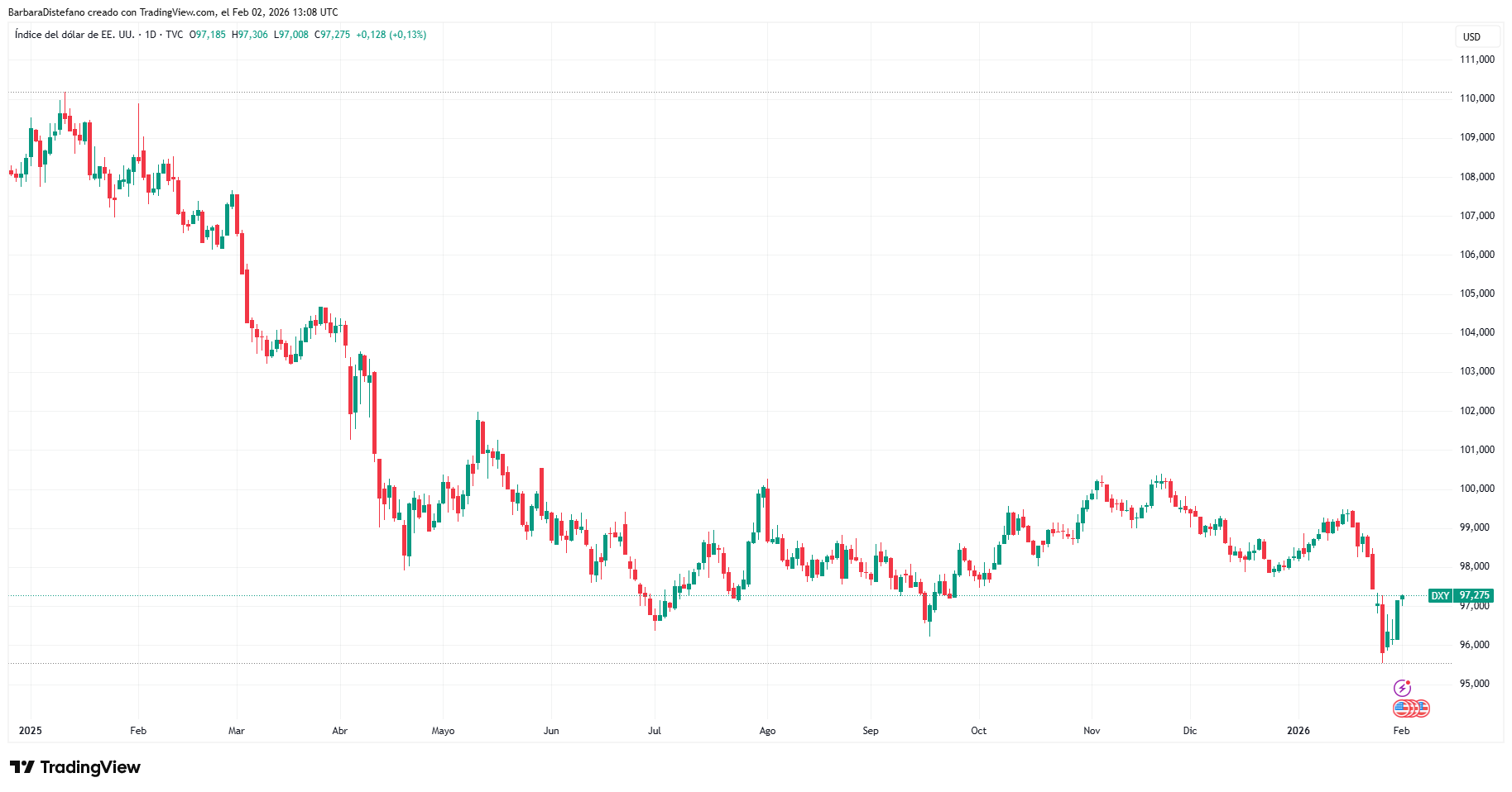 Esta reversión se intensificó tras la nominación de Kevin Warsh como presidente de la Reserva Federal. Luego del anuncio, el dólar medido por el DXY registró un repunte, cortando con la caída que tenía de momento. En este contexto, los inversores siguen de cerca los próximos pasos de la FED y del presidente estadounidense Donald Trump, especialmente ante sus amenazas de imponer aranceles a países aliados.