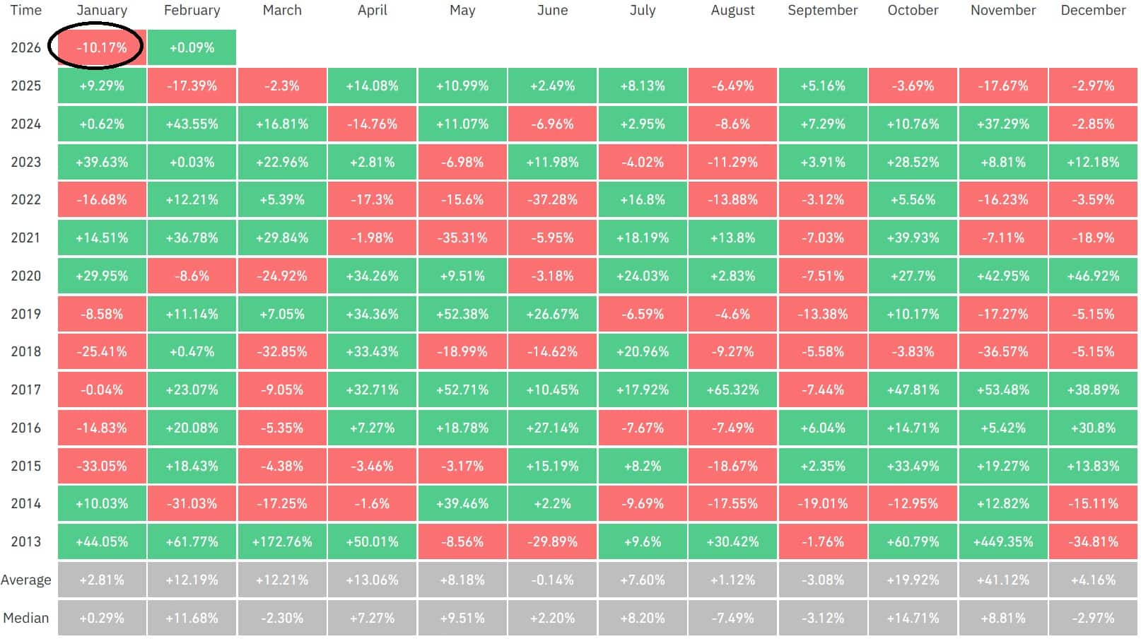 Bitcoin ($BTC), la principal criptomoneda del mercado, ha cerrado enero con un rendimiento mensual negativo del 10,17%, marcando así su cuarto mes consecutivo de pérdidas, según datos de Coinglass.