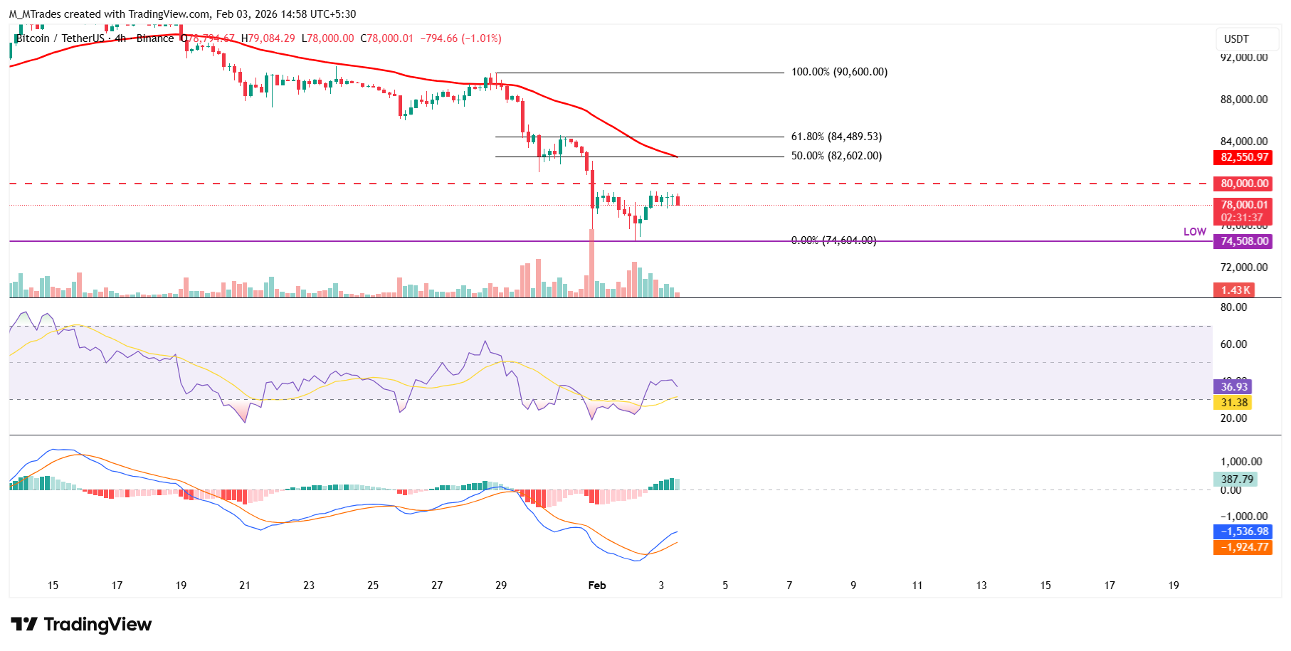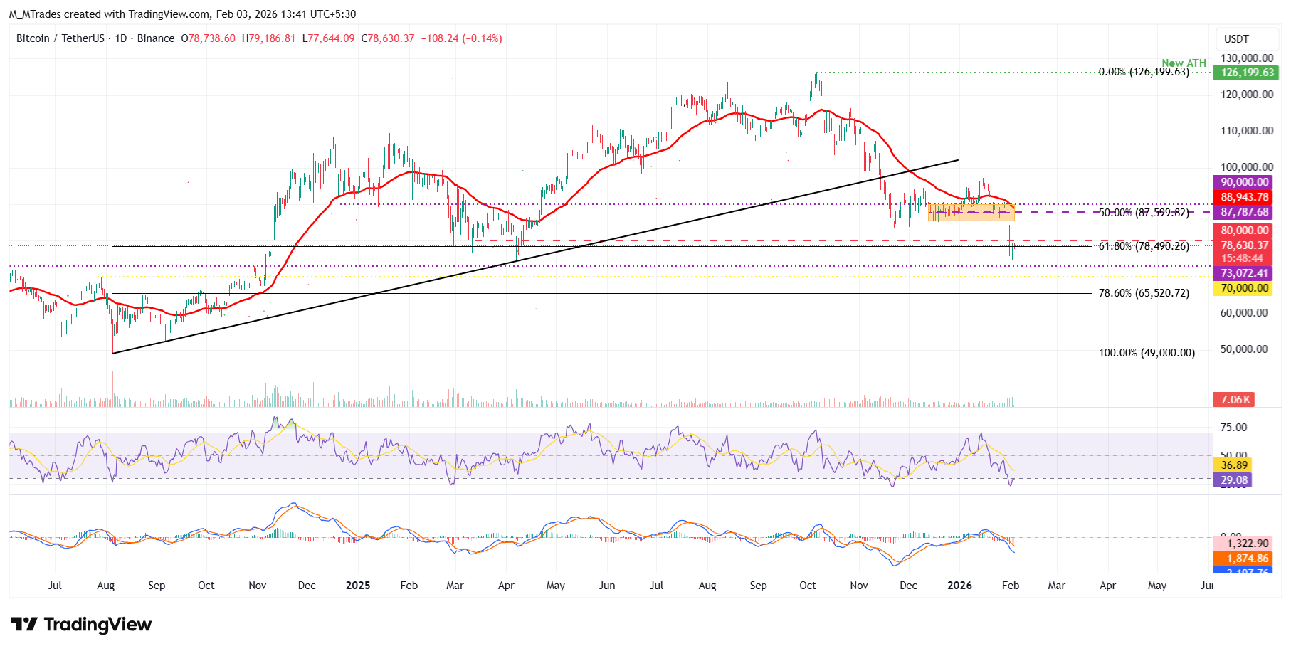 En el gráfico diario, el $BTC cerró por debajo del nivel de retroceso de Fibonacci del 61.8% (desde el mínimo de agosto de 2024 de 49.000$ hasta el máximo histórico de octubre de 2025 de 126.199$) en 78.490$ el domingo, y enfrenta resistencia alrededor de este nivel el martes.