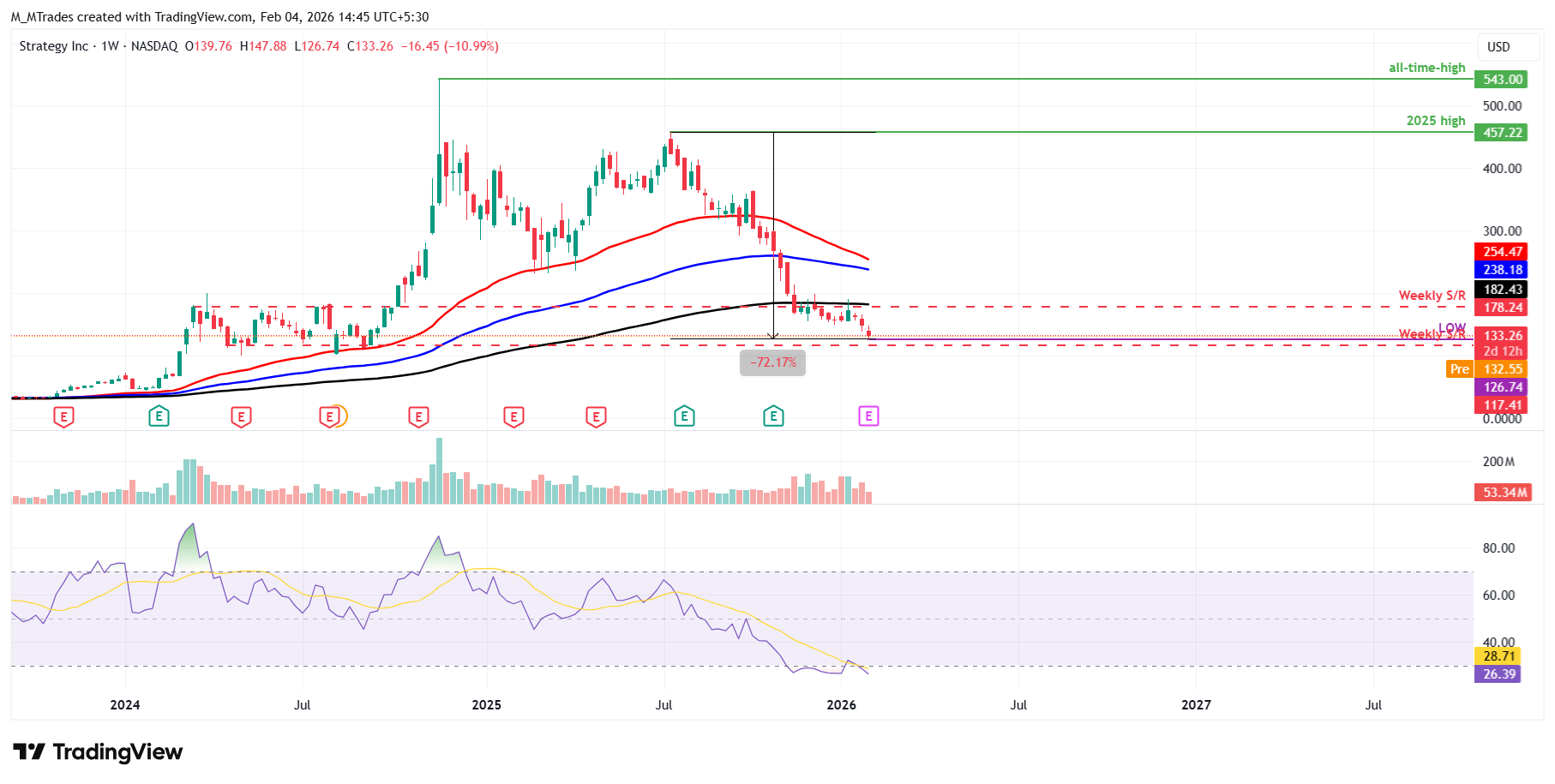 Como el mayor tenedor corporativo de Bitcoin, con 713.502 $BTC en sus reservas, el precio de las acciones de Strategy (MSTR) continuó su corrección, alcanzando un mínimo diario de 126.74$ el martes, una caída de más del 70% desde su máximo de 2025 de 457.22$.