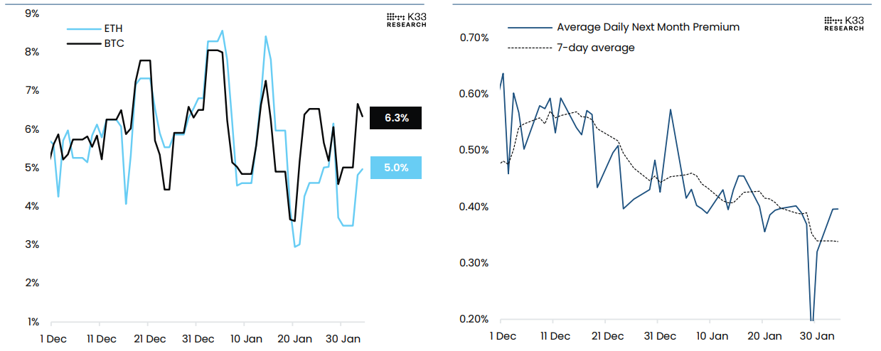 El gráfico (izquierda) a continuación muestra que la prima anualizada de futuros de $BTC se mantenía estable en 6.3% el martes, consistente con las primas observadas durante los últimos tres meses, señalando que los operadores permanecen en gran medida al margen en medio del incierto entorno de debilidad relativa. Además, aunque las primas de futuros han sido estables, la estructura a plazo continúa tendiendo a la baja, con la prima promedio de próximos meses de 7 días de CME (gráfico de la derecha) actualmente en mínimos no vistos desde la crisis bancaria de EE.UU. de marzo de 2023, apuntando hacia una considerable reticencia a añadir riesgo de calendario.