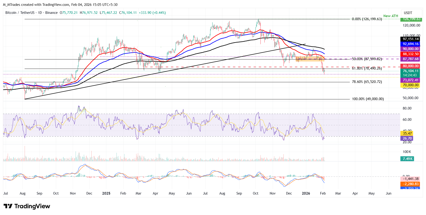 Si el $BTC se recupera, podría extender el avance hacia el nivel de retroceso de Fibonacci del 61.8% (desde el mínimo de agosto de 2024 de 49.000$ hasta el máximo histórico de octubre de 2025 de 126.199$) en 78.490$.
