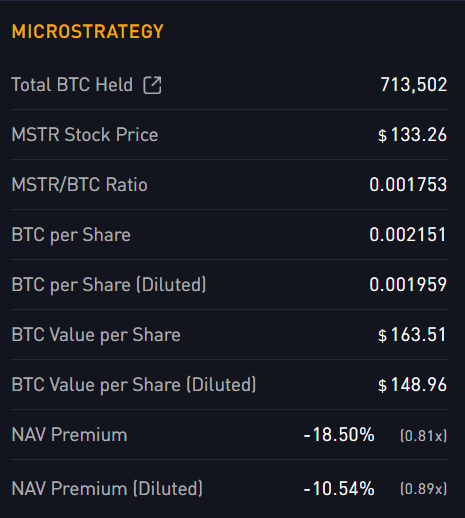 Mientras tanto, el actual indicador de prima NAV, que mide cuánto valora el mercado a la empresa en relación con el valor neto de sus tenencias de Bitcoin y otros activos, excluyendo pasivos, se sitúa en -18.50% (0.81x), lo que implica que el mercado valora a MSTR en el 81% del valor de sus tenencias de Bitcoin por acción (excluyendo otro valor comercial).