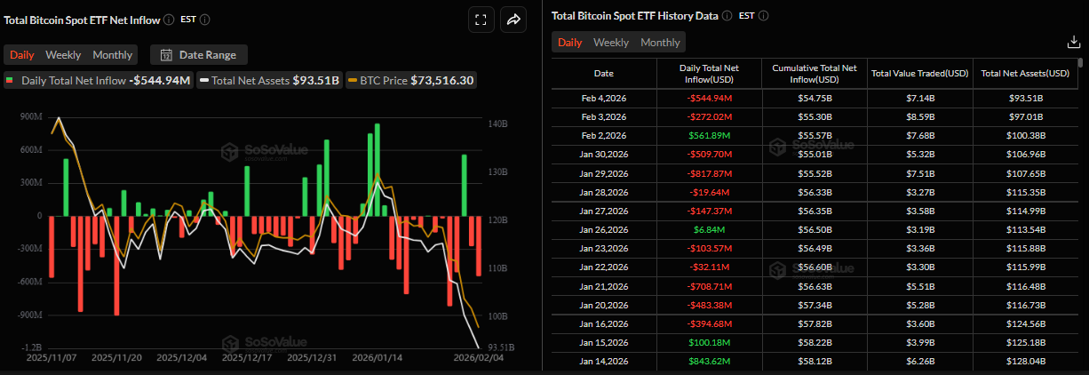 La demanda institucional de Bitcoin continúa desvaneciéndose hasta ahora esta semana. Según el gráfico de SoSovalue a continuación, los ETF de Bitcoin al contado registraron una salida de 544,94 millones de dólares el miércoles, marcando el segundo día consecutivo de retiros esta semana. Si esta salida se mantiene, el $BTC podría ver correcciones de precios adicionales.