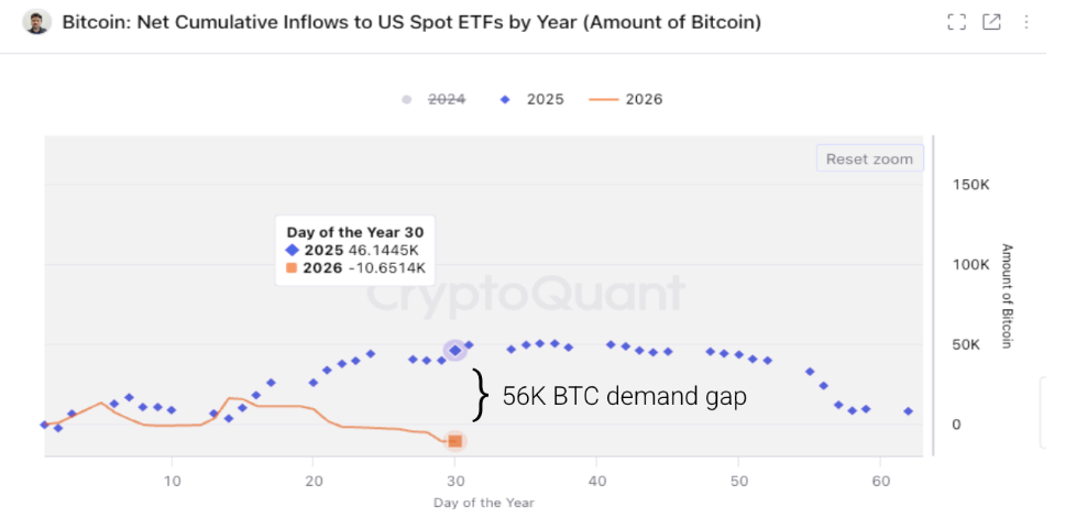 Además, el informe semanal de CryptoQuant del miércoles destacó que la demanda institucional de $BTC ha revertido materialmente. En este momento el año pasado, estos ETFs habían comprado 46.000 $BTC en términos netos, contribuyendo al crecimiento de la demanda de Bitcoin. Sin embargo, los ETF han sido vendedores netos de Bitcoin hasta ahora en 2026, reduciendo sus tenencias en 10.600 $BTC, dejando una brecha de 56.000 $BTC en comparación con el año pasado. Esto ha llevado a una menor demanda y mayor presión de venta.