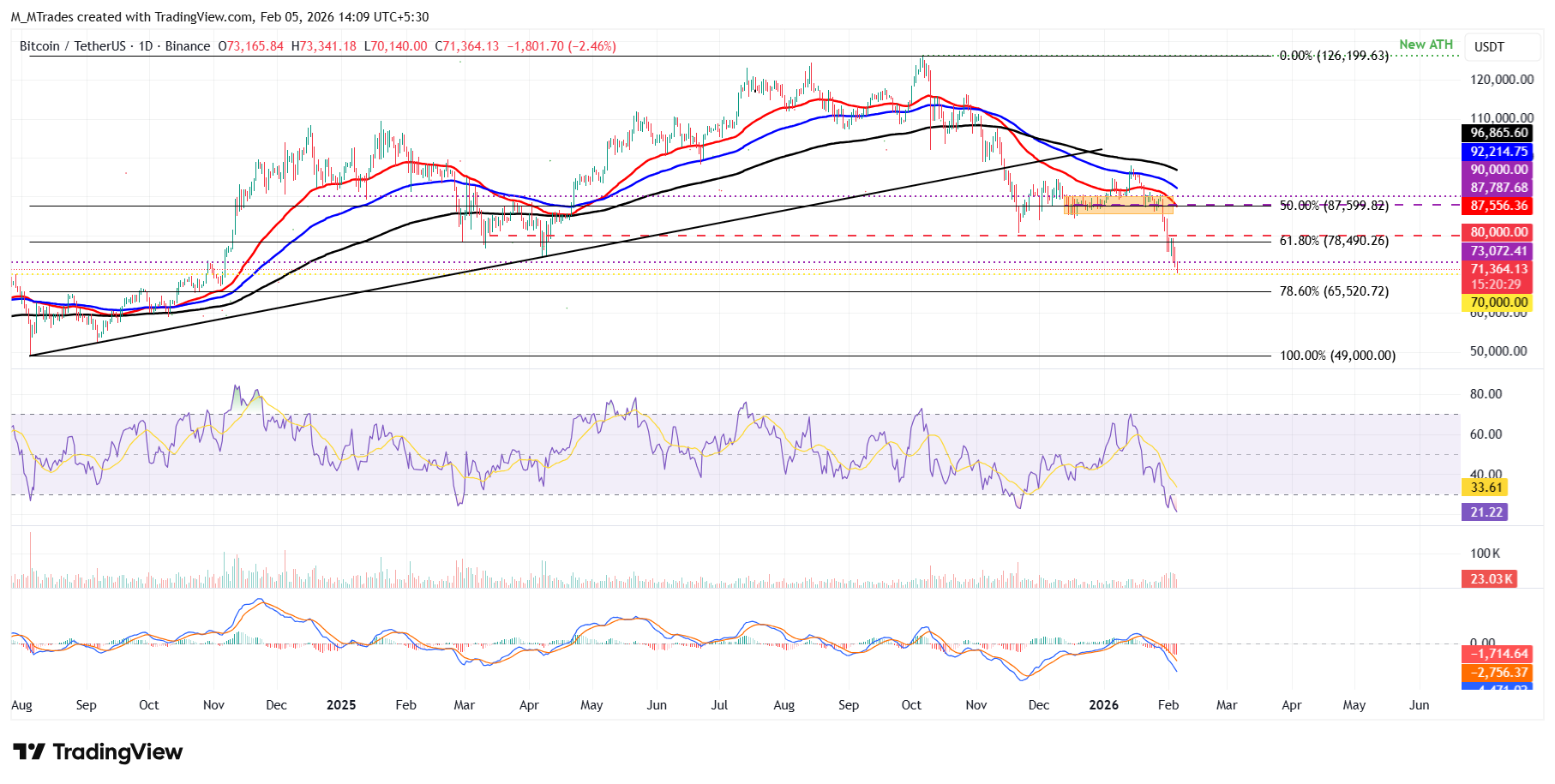 Si el $BTC cierra por debajo de su soporte diario en 73.072$, podría extender la caída hacia el nivel psicológico clave de 70.000$. Un cierre por debajo de la marca de 70.000$ podría extender las pérdidas hacia el nivel de retroceso de Fibonacci del 78.6% (desde el mínimo de agosto de 2024 de 49.000$ hasta el máximo histórico de octubre de 2025 de 126.199$) en 65.520$.