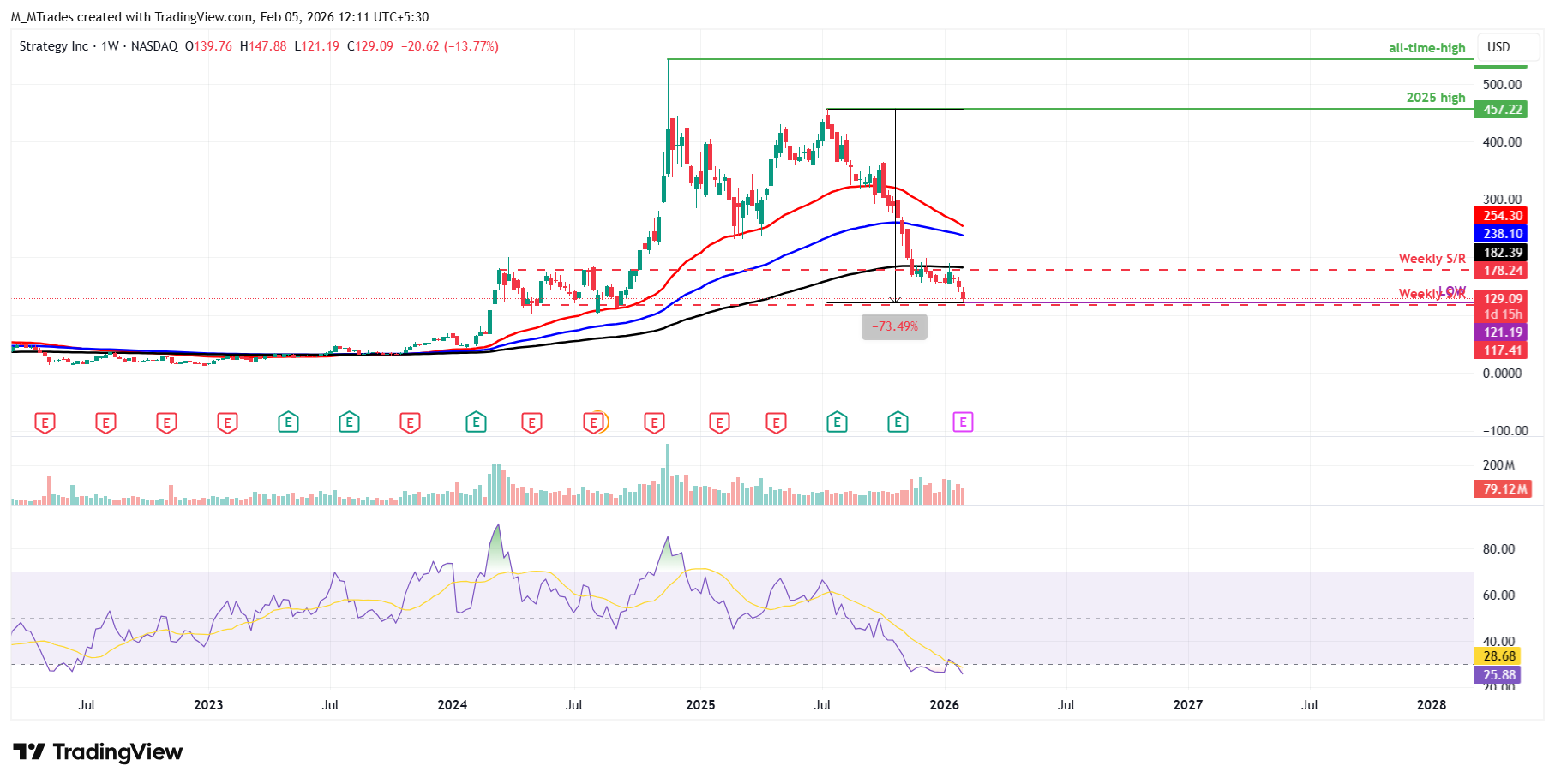 El gráfico semanal de MSTR a continuación muestra que su precio de acción ha caído más del 73% desde su máximo de 2025 de 457,22$, alcanzando un mínimo de 121,19$ el miércoles, niveles no vistos desde mediados de septiembre de 2024.