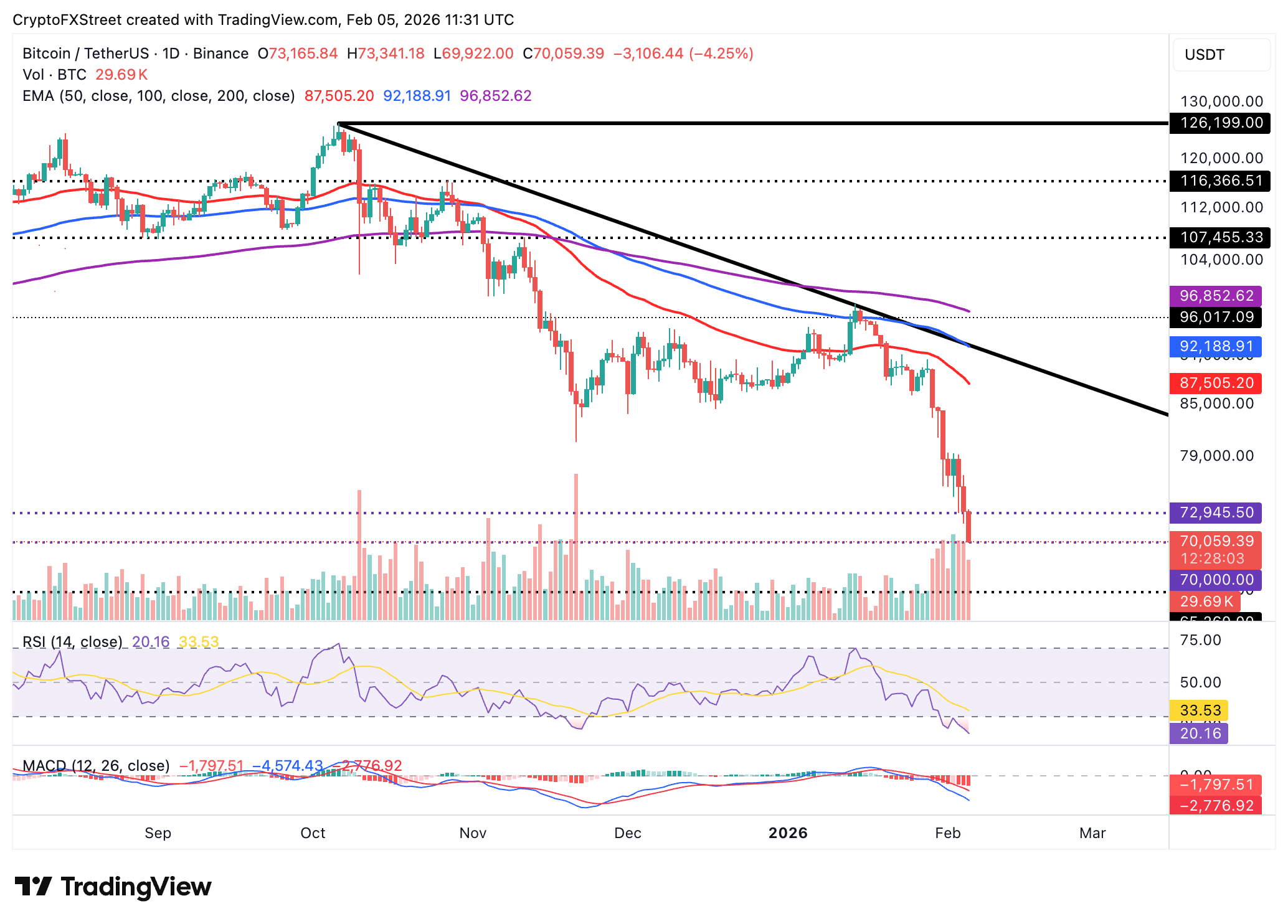 El precio del Bitcoin ($BTC) cae por debajo de 70.000$ el jueves, habiendo corregido casi un 20% en lo que va del año. El impulso del mercado se ha vuelto extremadamente bajista, con indicadores técnicos apuntando a un mayor descenso hacia el siguiente soporte clave en 65.000$.