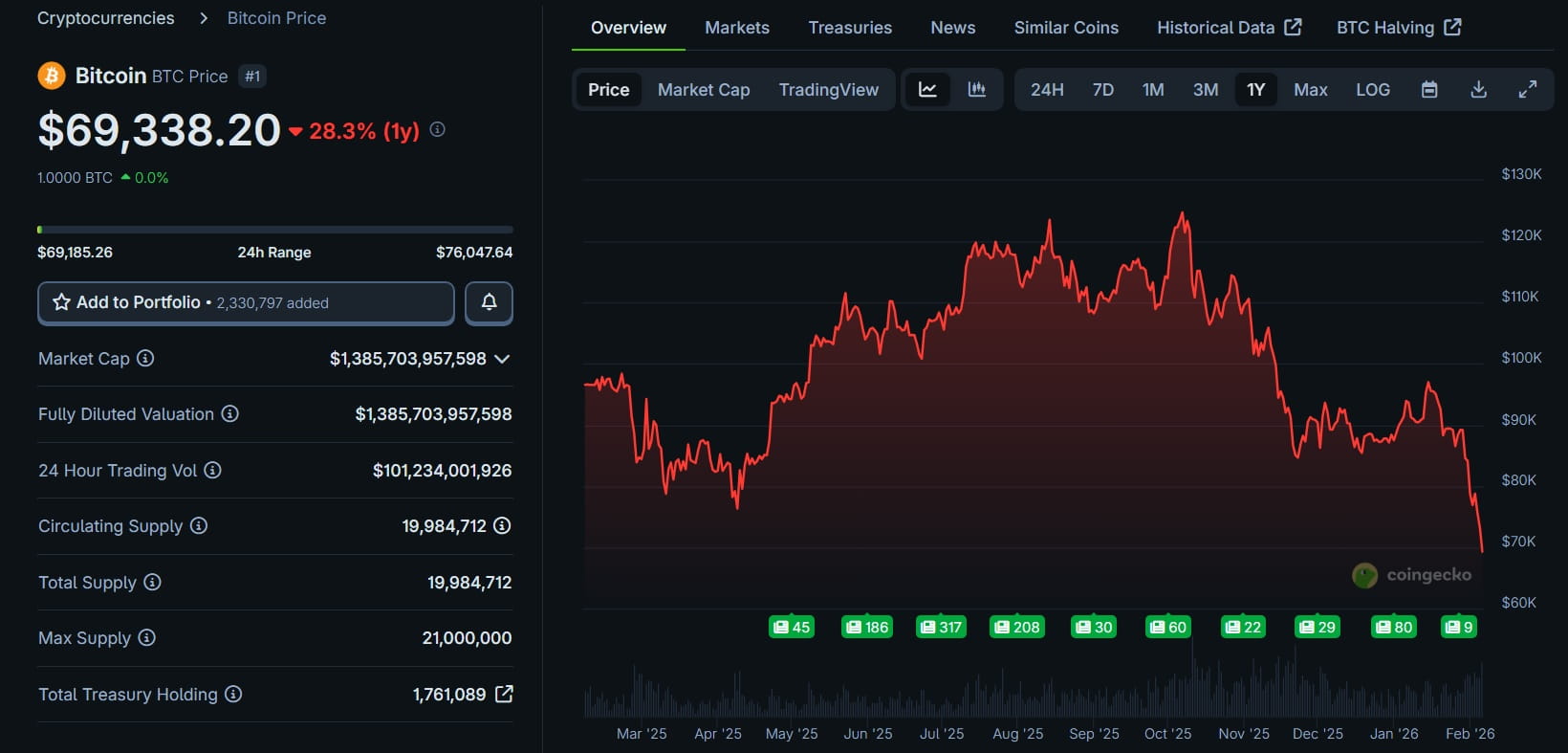 La principal criptomoneda visitó un mínimo de 69.185 dólares, un nivel visto por última vez en noviembre de 2024. Esta corrección se amplía a un 45% desde el máximo histórico de 126.000 dólares alcanzado en octubre pasado.