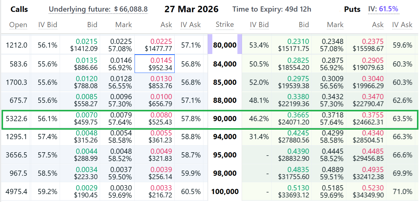Los mercados de opciones muestran un 6% de posibilidades de que Bitcoin regrese a los 90.000 dólares en marzo.