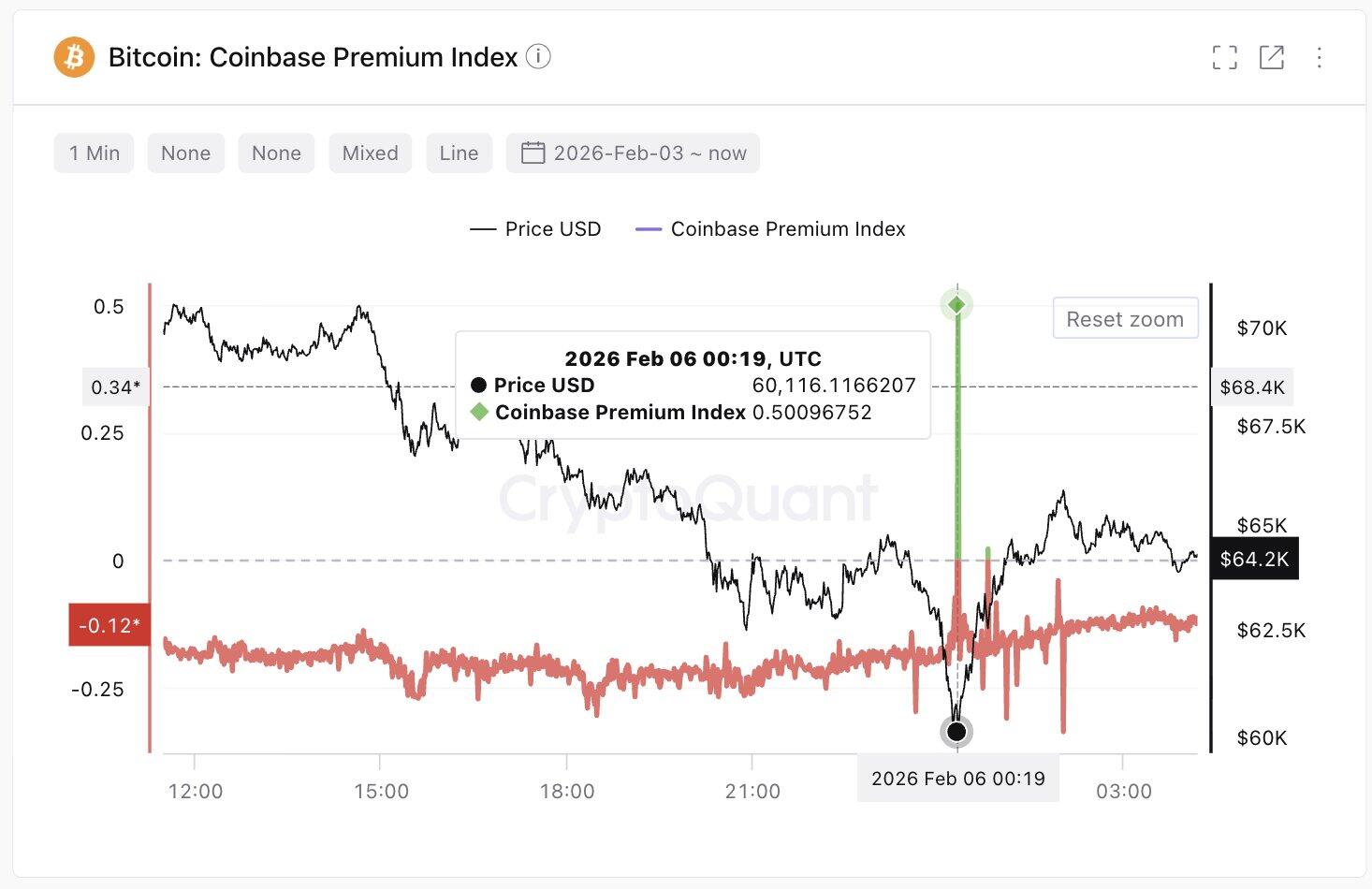 Young mostró que el Índice de Prima de Coinbase de CryptoQuant se disparó positivamente mientras el $BTC caía hacia los 60.000$ durante la mañana del viernes. Este aumento positivo indica que los grandes inversores en billeteras (ballenas) han acumulado $BTC durante esta caída, lo que podría señalar una recuperación a corto plazo dentro de la tendencia bajista en curso.