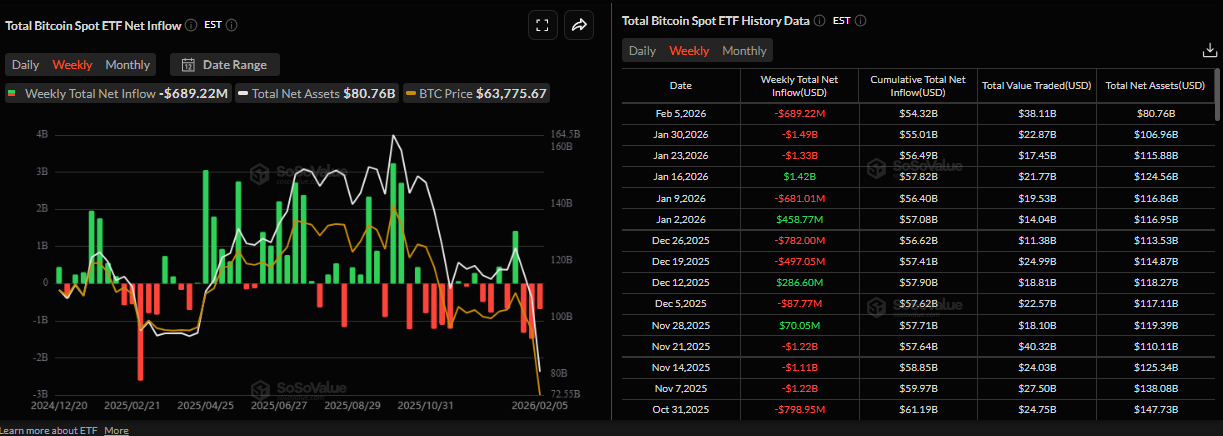 El precio del Bitcoin ($BTC) se recupera ligeramente, cotizando a 65.000$ en el momento de escribir el viernes, después de alcanzar un mínimo de 60.000$ durante la sesión asiática. El Rey Cripto ha permanecido bajo presión hasta ahora, registrando tres semanas consecutivas de pérdidas superiores al 30%. La demanda institucional del $BTC continúa debilitándose, señalando una tercera semana consecutiva de retiros.