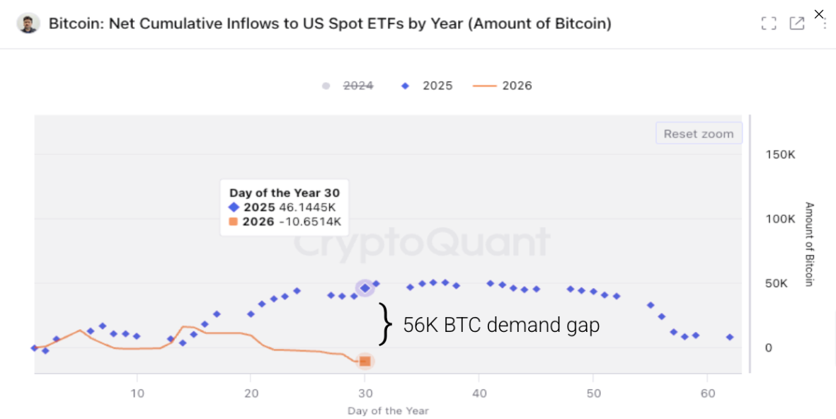 Un análisis más profundo de la demanda institucional revela que la demanda de $BTC ha revertido materialmente. El gráfico de CryptoQuant a continuación muestra que, en comparación con el mismo período del año pasado, estos ETFs compraron 46.000 $BTC en términos netos, contribuyendo al crecimiento de la demanda de Bitcoin. Sin embargo, los ETFs han sido vendedores netos de Bitcoin hasta ahora en 2026, reduciendo sus tenencias en 10.600 $BTC, dejando un déficit de 56.000 $BTC en comparación con el año pasado. Esto ha llevado a una menor demanda y mayor presión vendedora.