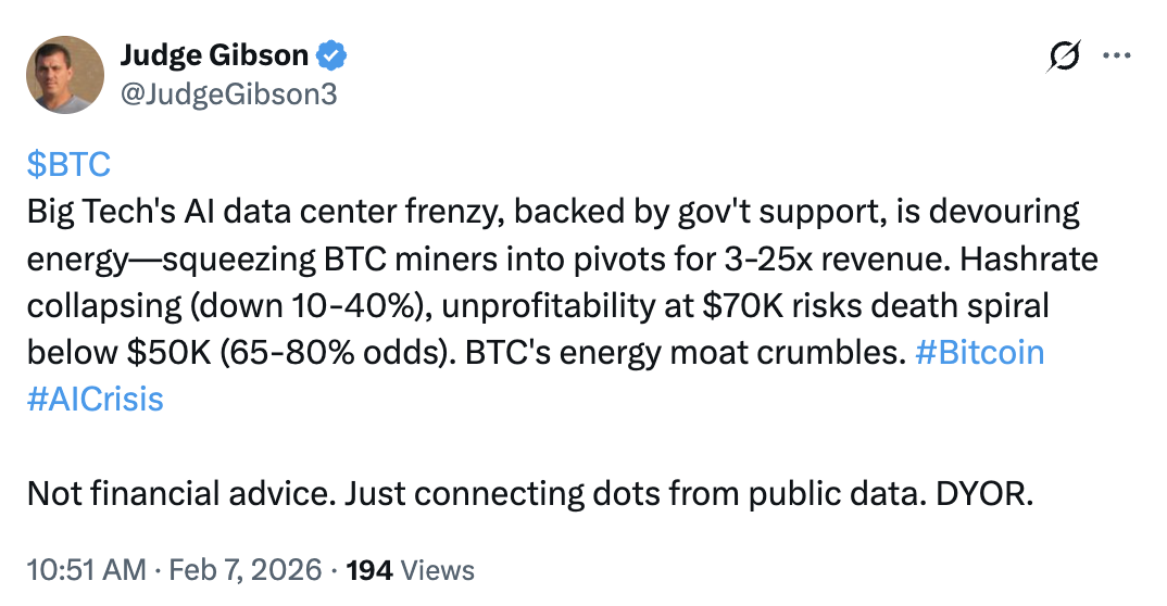 En una publicación del sábado en X, el analista Judge Gibson dijo que la creciente demanda de centros de datos de IA ya está obligando a los mineros de Bitcoin a cambiar su enfoque, lo que ha provocado una caída del 10 al 40% en la tasa de hash.