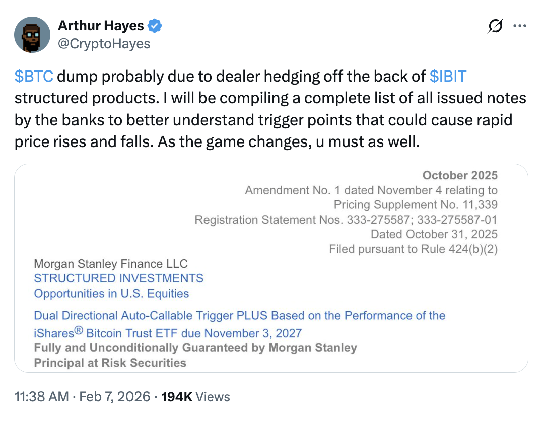 Él sugirió que los bancos, incluyendo Morgan Stanley, pueden haberse visto obligados a vender Bitcoin (o activos relacionados) para cubrir su exposición en notas estructuradas vinculadas a los ETF de Bitcoin al contado, como el IBIT de BlackRock.