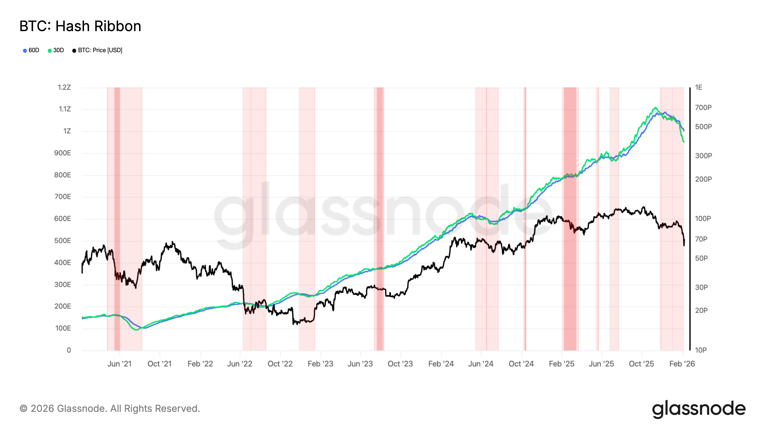Mientras tanto, el indicador Hash Ribbons también emitió una advertencia: el promedio de la tasa de hash de 30 días ha caído por debajo del de 60 días, una inversión negativa que históricamente señala un estrés agudo en los ingresos de los mineros y aumenta el riesgo de capitulación.