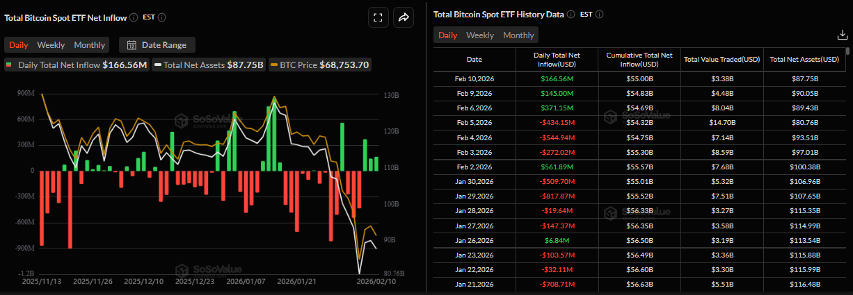 La demanda institucional muestra leves signos de recuperación hasta ahora esta semana. Según datos de SoSoValue, los ETFs de Bitcoin al contado registraron una leve entrada de 166,56 millones de dólares el martes, marcando el tercer día consecutivo de flujos netos positivos desde el viernes pasado. Si las entradas continúan e intensifican, el $BTC podría ver alguna recuperación.