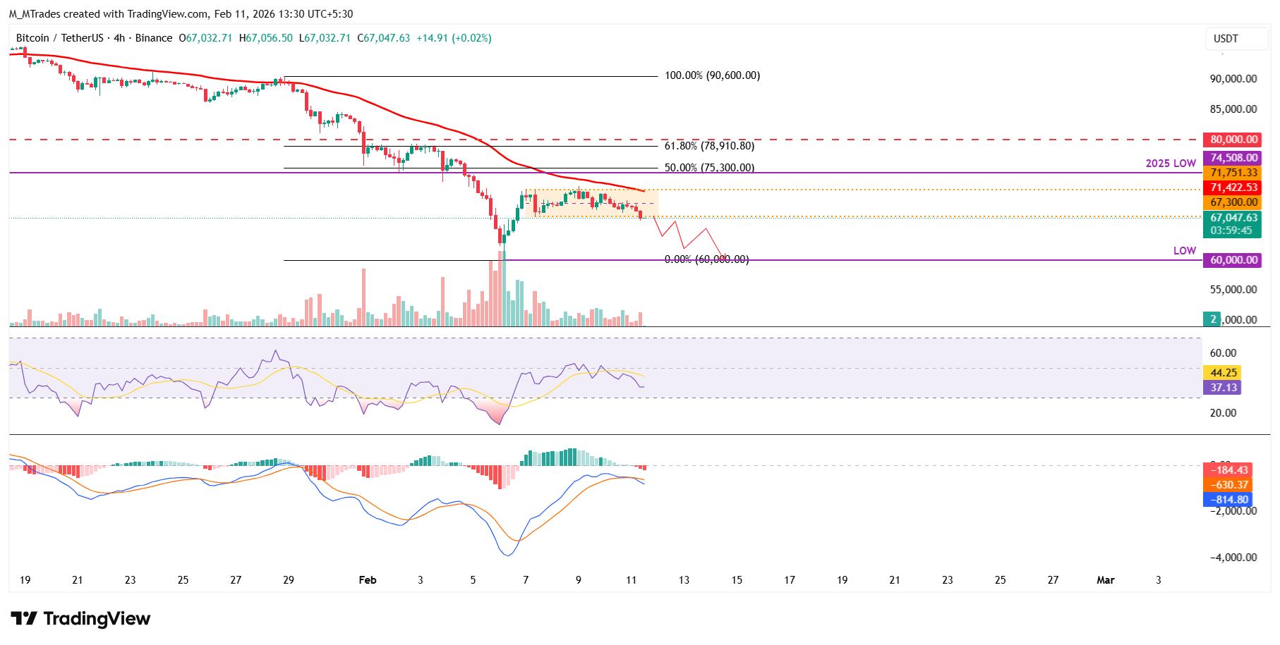 Si el $BTC rompe y cierra por debajo del límite inferior de consolidación en 67.300$, podría extender la corrección para volver a visitar el mínimo del viernes en 60.000$.