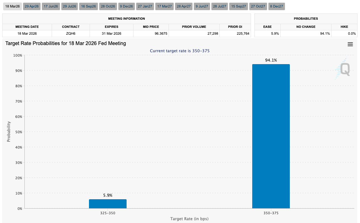 Los últimos datos de la FedWatch Tool del CME Group sitúan las probabilidades de una pausa en las tasas en marzo por encima del 90%.