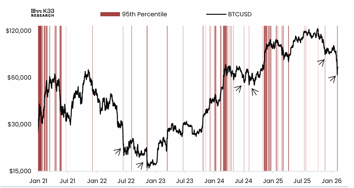Un informe de K33 explica que los picos de volumen ocurren durante extremos locales. El rendimiento de BTCUSD superpuesto con días de volumen de negociación en el percentil 95 en comparación con una ventana móvil de 365 días, como se muestra en el gráfico a continuación.
