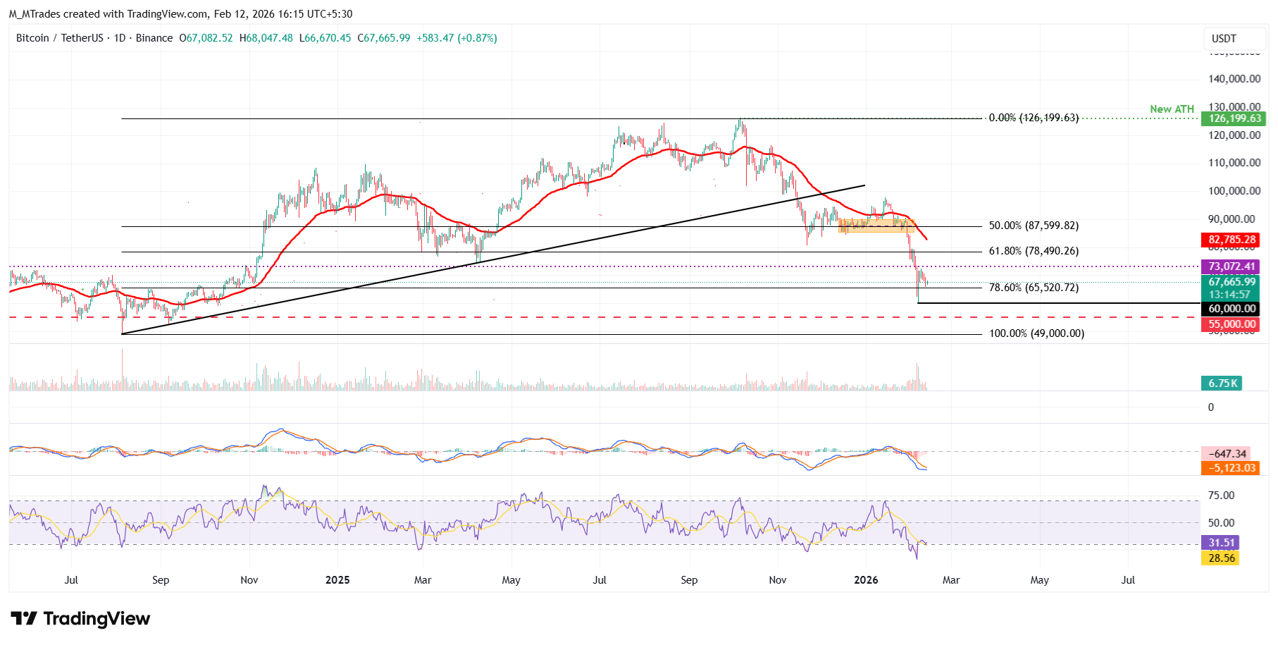 En el gráfico diario, el Bitcoin enfrentó rechazo cerca de la resistencia diaria en 73.072$ el domingo y ha caído casi un 5% hasta el miércoles, acercándose al retroceso de Fibonacci del 78.6% (dibujado desde el mínimo de agosto de 2024 de 49.000$ hasta el máximo histórico de octubre de 2025 de 126.199$) en 65.520$. Al momento de escribir el jueves, $BTC se cotiza a 67.600$.