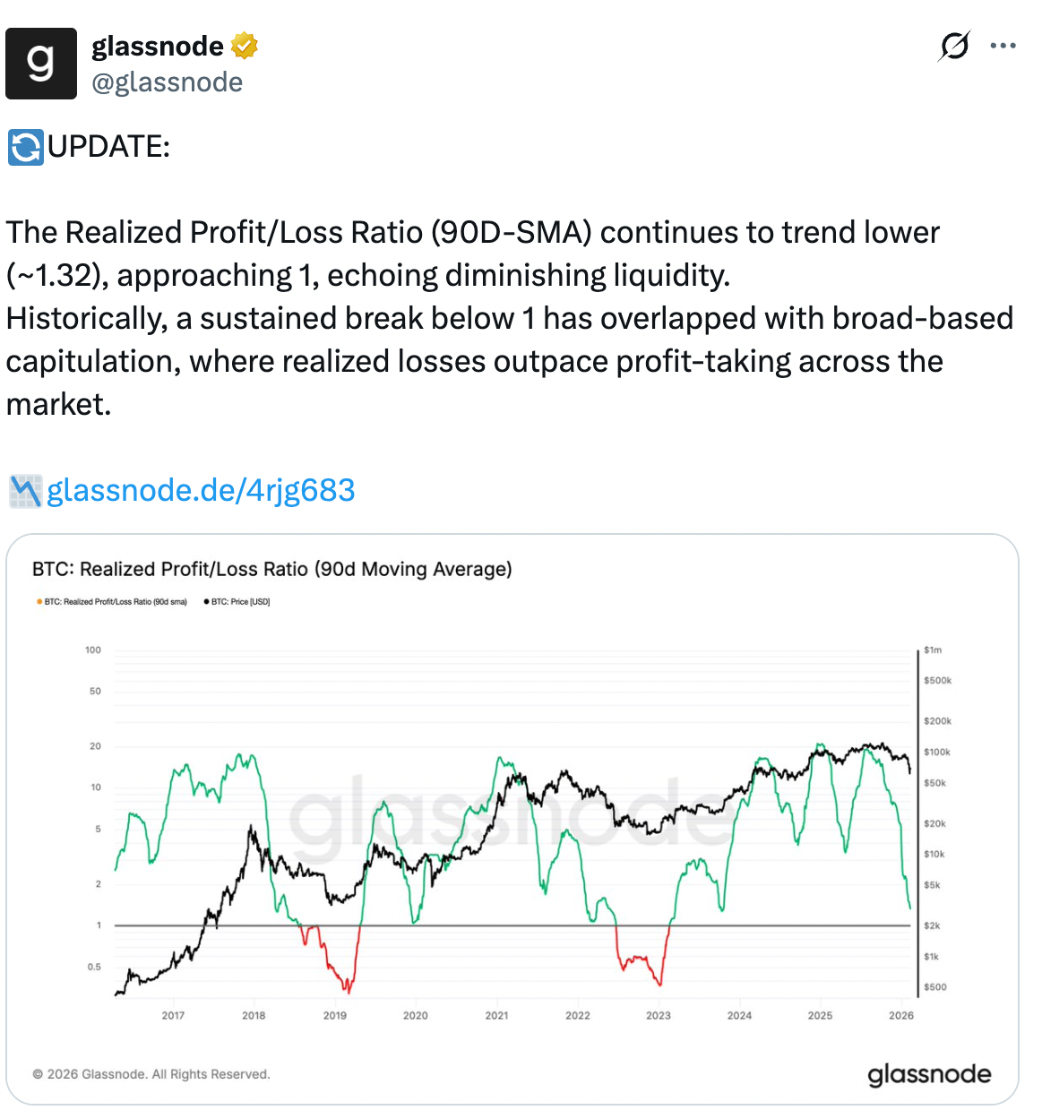 El Ratio de Ganancias/Pérdidas Realizadas de Bitcoin está a punto de caer por debajo de 1, niveles que históricamente se han alineado con una “capitulación generalizada, donde las pérdidas realizadas superan la toma de ganancias en todo el mercado”, dijo Glassnode.