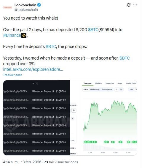 Un análisis de Lookonchainen X ha revelado el notorio comportamiento de una ballena desconocida de Bitcoin ($BTC). Es que la misma realiza depósitos antes de que el precio descendiera un poco más, según Jordan Lyanchev en Cryptopotato.