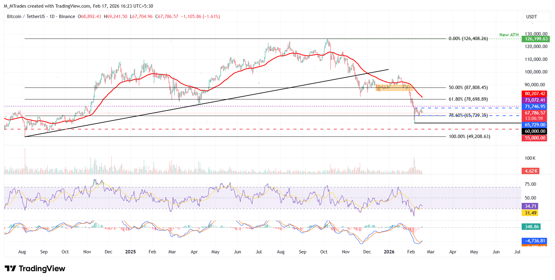 Si el Rey de las Criptomonedas cierra por debajo del nivel inferior de consolidación en 65.729$, podría extender la caída hacia el nivel de soporte clave en 60.000$.