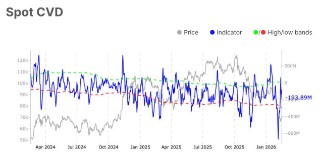 El gráfico a continuación muestra que el CVD al contado ha mejorado de -352,9 millones de dólares a principios de febrero a -193,9 millones de dólares el lunes, señalando un enfriamiento en la presión de venta. Sin embargo, el valor sigue siendo negativo, cayendo dentro de las bandas estadísticas (roja y verde), indicando una agresión de mercado neutral y signos tempranos de estabilización.