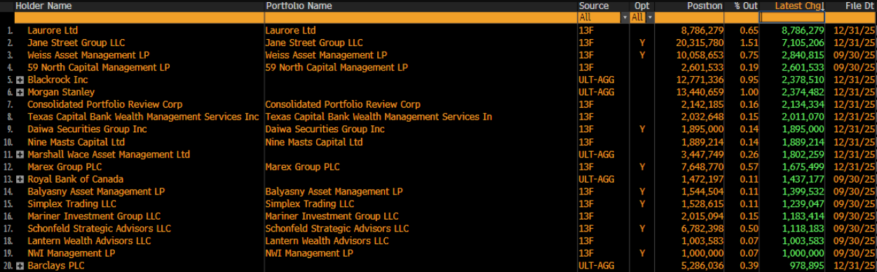 Además de Laurore y Jane Street, varias instituciones realizaron movimientos significativos con IBIT en el cuarto trimestre de 2025. Según se informa, Weiss Asset Management añadió alrededor de 2,8 millones de acciones (107,5 millones de dólares), mientras que 59 North Capital aumentó su posición en 2,6 millones de acciones (99,8 millones de dólares).