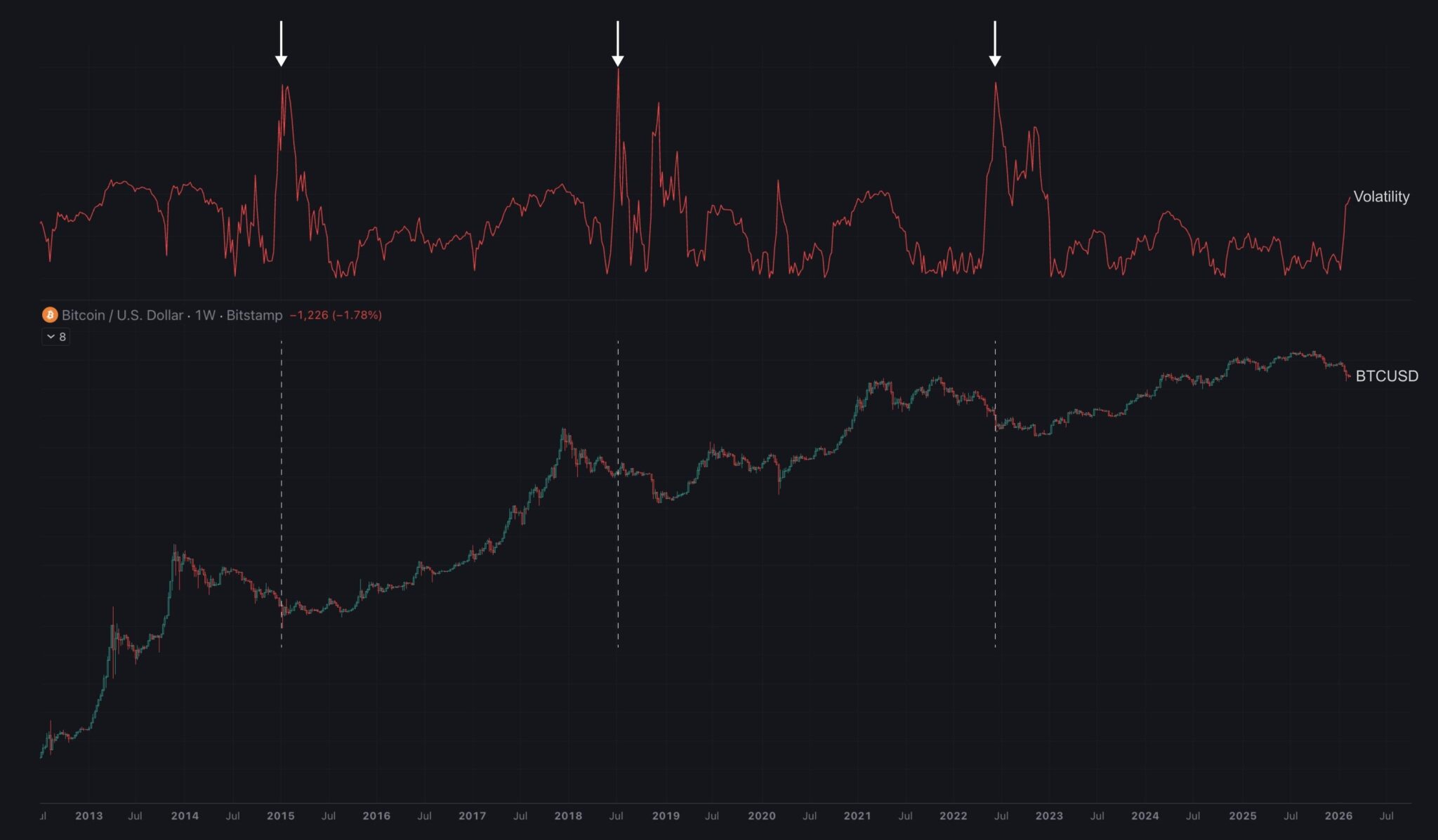 Uno de los indicadores que respalda su diagnóstico es la fluctuación de precios, algo que permite detectar posibles cambios de tendencia. Para Woo, bitcoin entró en un mercado bajista en 2026 «cuando la volatilidad se disparó rápidamente».
