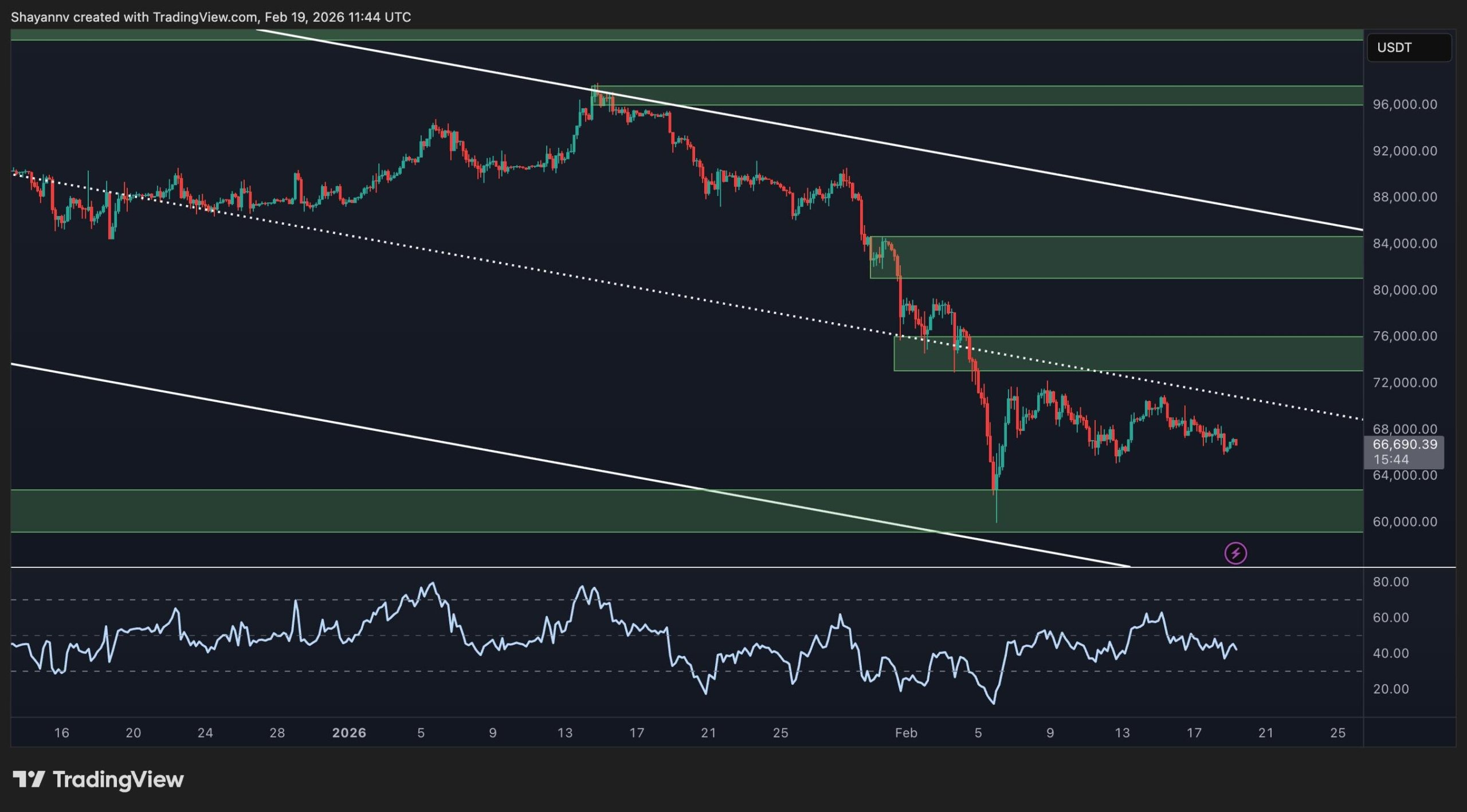 Los indicadores de momentum continúan apagados, con el RSI muy por debajo del nivel neutral y sin lograr una divergencia alcista sólida. A menos que el precio recupere el clúster de resistencia de $75.000-$80.000 y cierre por encima del punto medio del canal, el sesgo general seguirá inclinado hacia una continuación a la baja o una consolidación prolongada cerca del soporte de $60.000.