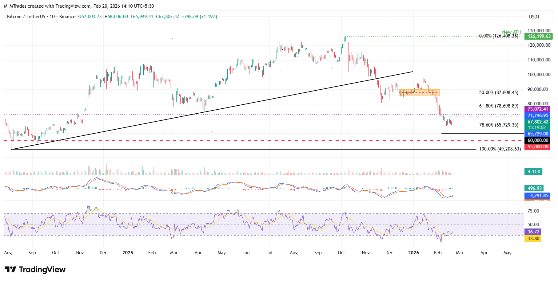 Si $BTC cierra por debajo del nivel inferior de consolidación en 65.729$ de manera diaria, podría extender la caída hacia el nivel de soporte clave en 60.000$.