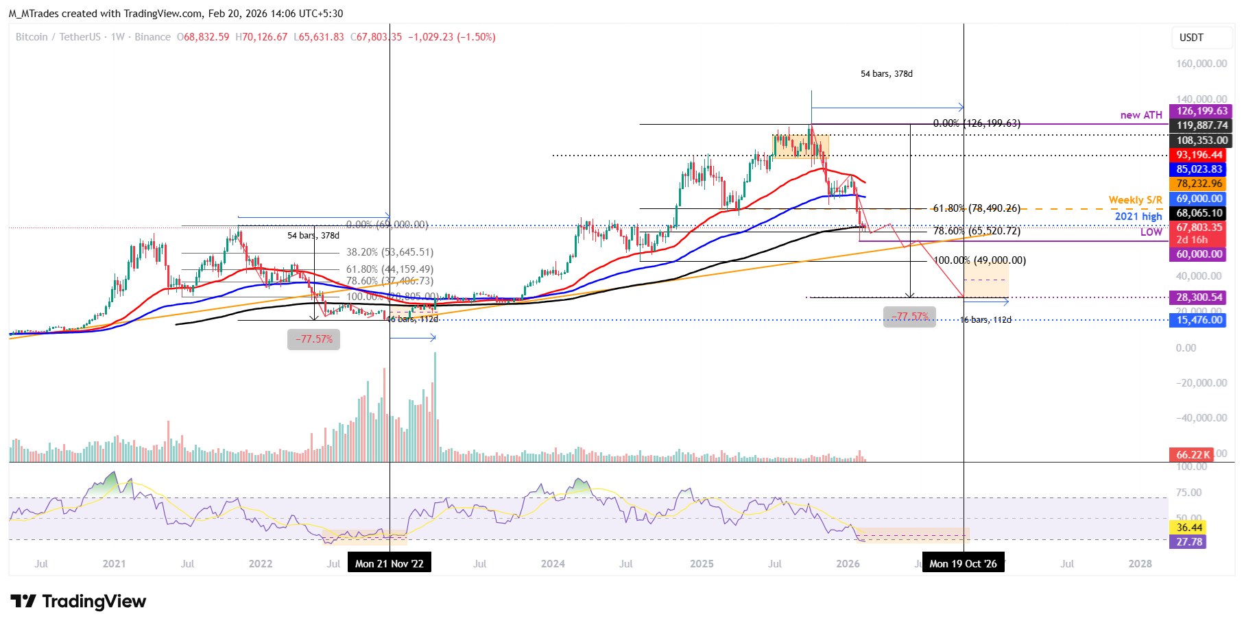 En el período 2025-2026, $BTC alcanzó un nuevo $ATH de 126.199$ en octubre de 2025 y desde entonces ha corregido un 47% hasta la tercera semana de febrero, al momento de escribir el viernes, cayendo por debajo de la media móvil exponencial de 200 semanas en 68.065$.