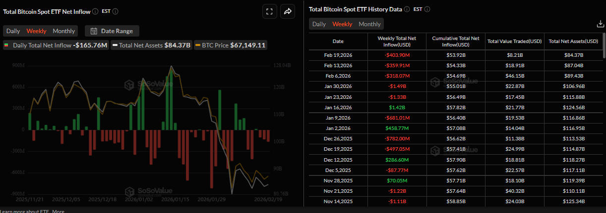 El precio del Bitcoin ($BTC) continúa negociándose dentro de una zona de rango, rondando los 67.000$ en el momento de escribir estas líneas el viernes, y cayendo ligeramente hasta ahora esta semana, sin señales de recuperación. La acción del precio en curso aumenta el riesgo de una ruptura a medida que la demanda institucional sigue debilitándose, apuntando a una quinta semana consecutiva de retiros de los fondos cotizados en bolsa (ETF) de $BTC al contado. Además, las actas del Comité Federal de Mercado Abierto (FOMC) de línea dura, junto con el aumento de las tensiones geopolíticas entre EE.UU. e Irán, están presionando aún más a la criptomoneda más grande por capitalización de mercado.