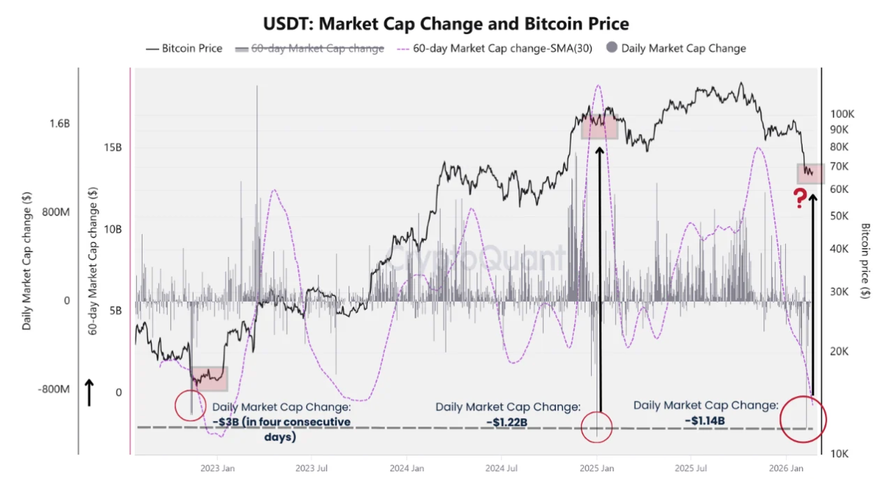 La única otra ocasión en la que la capitalización de mercado del $USDT descendió en USD 3.000 millones en 60 días fue a finales de 2022, justo cuando Bitcoin alcanzaba su mínimo cíclico cerca de USD 15.500, en medio del máximo temor y las ventas forzadas.