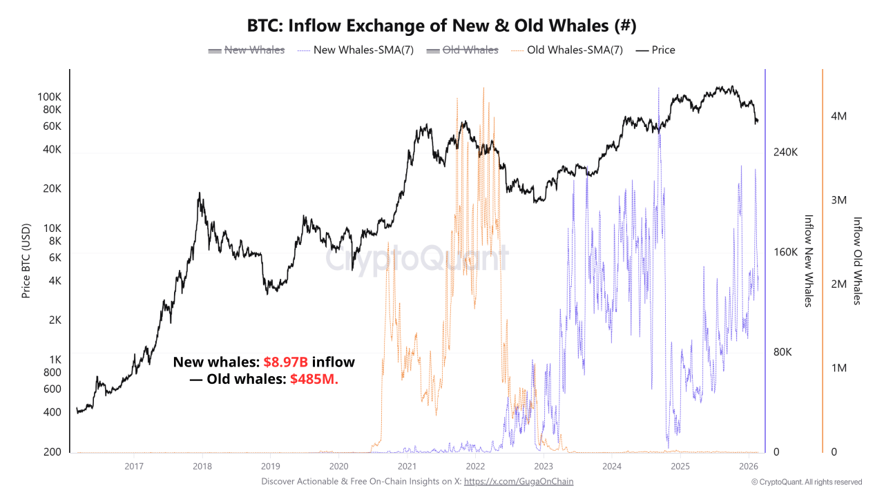 - Ballenas nuevas (Inflow SMA 7D): este grupo lidera la carrera con el envío de 138.348 $BTC a los exchanges, lo que representa el 95% de los depósitos actuales (aproximadamente $8.97 mil millones).