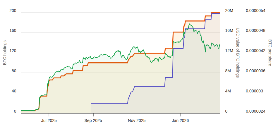 Desde entonces, la compañía ha ejecutado compras periódicas y transparentes. Comenzó con adquisiciones modestas hasta alcanzar 54 $BTC en junio de 2025. Posteriormente sumó 32 $BTC en diciembre para situarse en 161 $BTC.