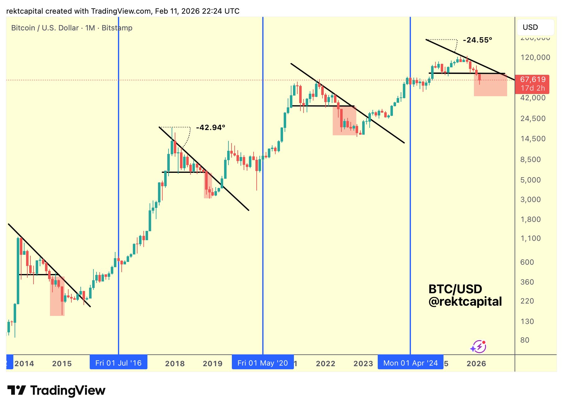 En sus mínimos de 15 meses registrados a principios de febrero, el par $BTC/USD alcanzó una caída máxima de alrededor del 53% frente a su máximo histórico de octubre de 2025, que fue de USD 126.200.