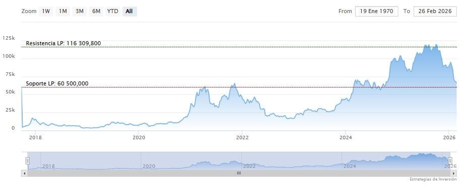 El soporte a mediano y largo plazo se mantiene en los 60.500 dólares. Mientras, los indicadores de Ei se muestran mixtos.
