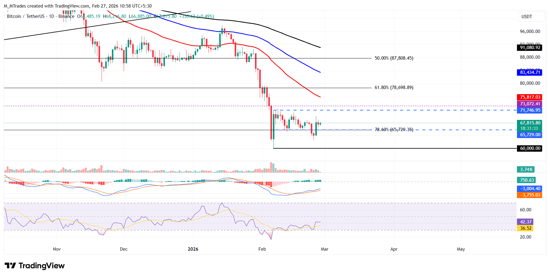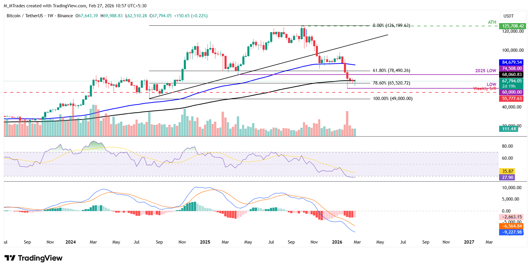 Si la EMA de 200 semanas en 68.068$ se mantiene como resistencia y $BTC cierra por debajo de 65.520$ de forma semanal, podría extender las pérdidas hacia el nivel psicológico clave de 60.000$, con el siguiente nivel de soporte alrededor de 55.777$, el nivel de soporte semanal.