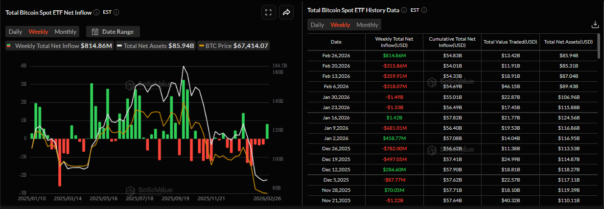 La demanda institucional muestra algunos signos de optimismo hasta ahora esta semana. Según datos de SoSoValue, los ETF de Bitcoin al contado han registrado una entrada de 814,86 millones de dólares hasta el jueves. Si esta tendencia continúa hasta el viernes, rompería una racha de cinco semanas consecutivas de salidas desde el 23 de enero. Si estas entradas continúan e intensifican, el $BTC podría ver una recuperación en las próximas semanas.