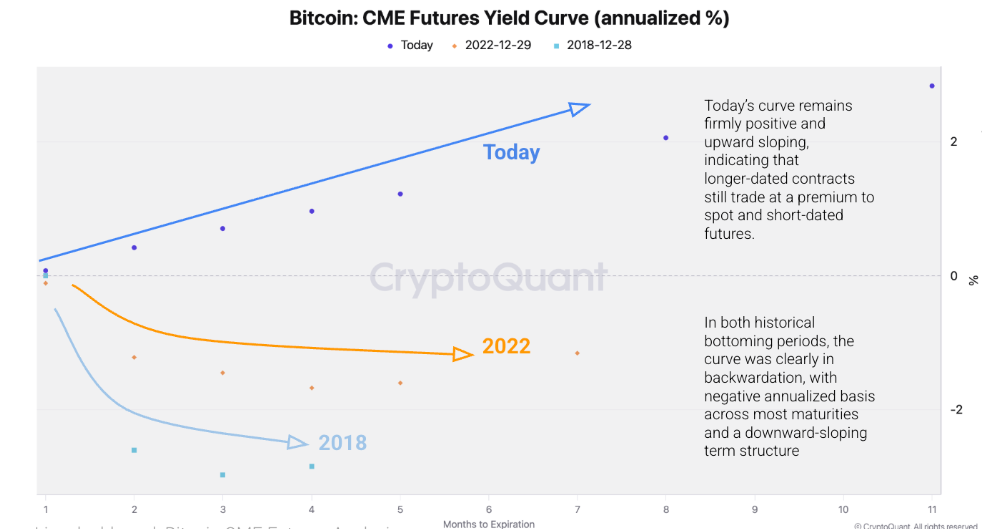 "En ambos períodos históricos de formación de fondo, la curva estaba claramente en backwardation, con una base anualizada negativa en la mayoría de los vencimientos y una estructura a plazo en pendiente descendente, reflejando un desapalancamiento forzado, presión de cobertura y posicionamiento angustiado típico de las fases de capitulación. En contraste, la curva de hoy se mantiene firmemente positiva y en pendiente ascendente, indicando que los contratos a más largo plazo aún se negocian a una prima sobre el spot y los futuros a corto plazo," informó el analista de CryptoQuant.