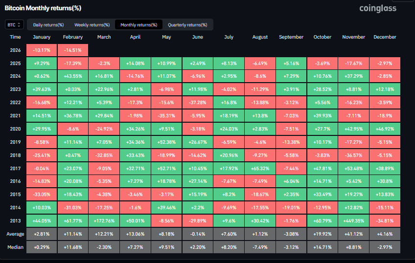 El Bitcoin está en camino de cerrar febrero con pérdidas de dos dígitos hasta el viernes, situándose alrededor del -14,51%. Según datos de Coinglass, el $BTC ha registrado dos caídas mensuales consecutivas al inicio del año, bajando un 10.17% y un 14.51%, respectivamente, una ocurrencia relativamente rara al observar su rendimiento histórico. Si febrero finalmente termina en territorio negativo, lo que parece muy probable, marcaría el quinto mes consecutivo de corrección desde octubre de 2025. Tal racha de pérdidas consecutivas no se había visto desde 2018, cuando el $BTC cayó de agosto a diciembre.