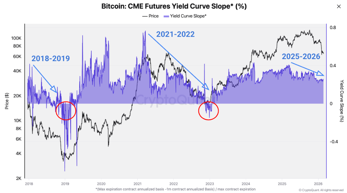 El gráfico a continuación muestra que la pendiente de la curva de rendimiento de los futuros de Bitcoin en la Chicago Mercantile Exchange (CME) ha estado tendiendo a la baja desde principios de 2025, reflejando el patrón observado antes de los ciclos de mercado bajista de 2018-2019 y 2021-2022.