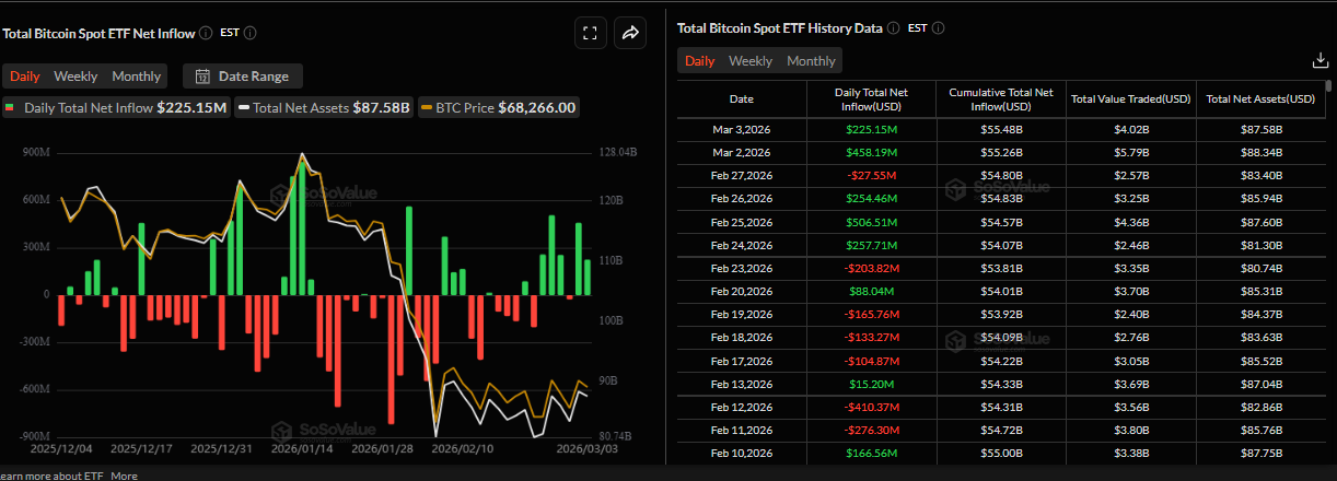 La demanda institucional ha permanecido robusta hasta ahora esta semana a pesar de la guerra en curso entre EE.UU. e Irán, que comenzó durante el fin de semana. Los datos de SoSoValue muestran que el ETF de Bitcoin al contado registró entradas de 225.15 millones de dólares el martes, marcando el segundo día consecutivo de flujos positivos esta semana, tras una entrada semanal positiva la semana pasada. Si estas entradas continúan e intensifican, el $BTC podría ver una recuperación en los próximos días.