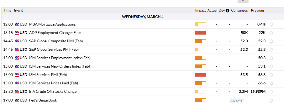 La captura de pantalla del calendario económico de EE.UU. a continuación muestra que los principales lanzamientos del miércoles serán los datos de Cambio de Empleo ADP para febrero y los números del Índice de Gerentes de Compras de Servicios de febrero publicados por el Instituto de Gestión de Suministros (ISM).