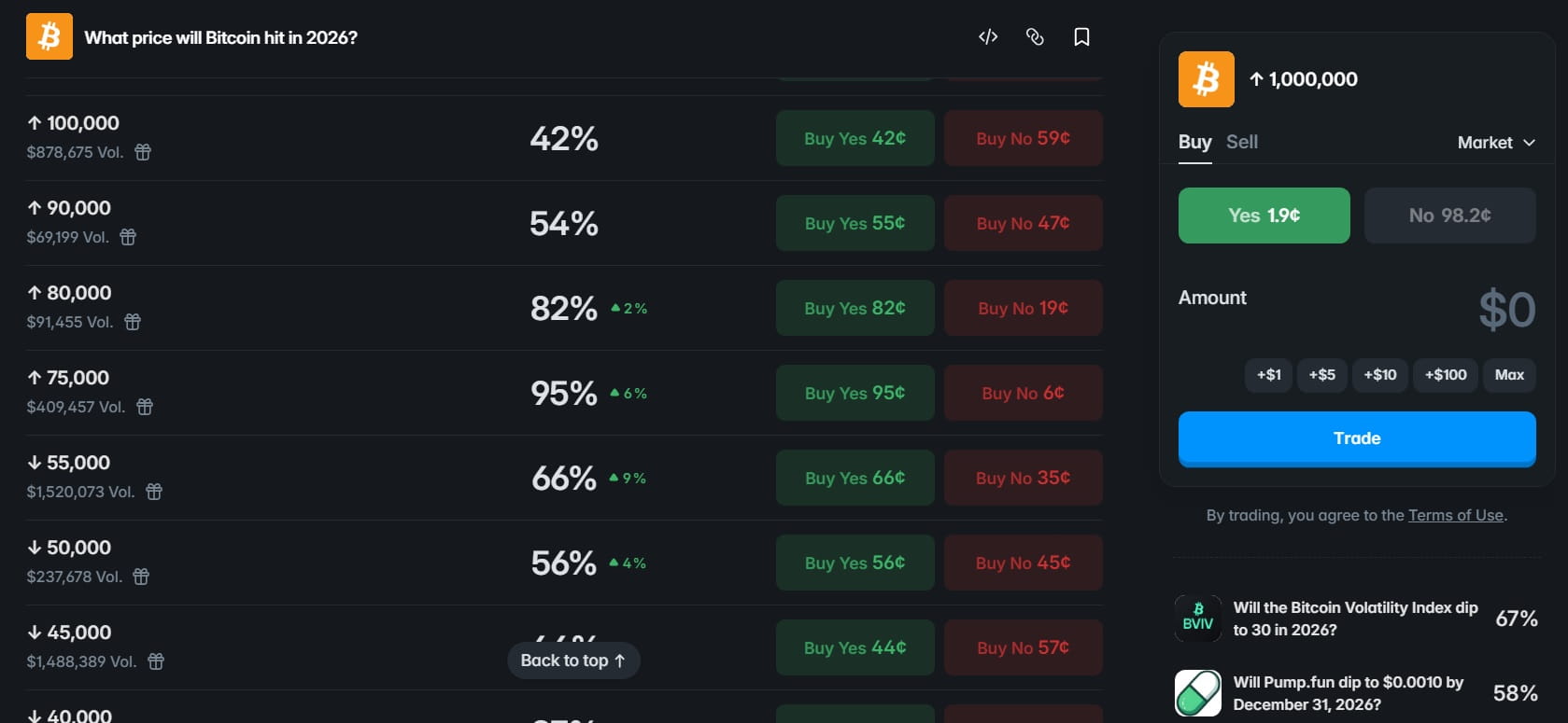 Una primera alternativa, para quien cree que $BTC “ya terminó por este año”, es posicionarse de forma explícita en contra del precio. El texto plantea la lógica de “si no puedes vencerlos, únete a ellos”, aplicada al lado bajista: comprar contratos que pagan si Bitcoin cae a determinados niveles durante 2026 y luego cerrar la posición cuando el precio se acerque a esos objetivos.